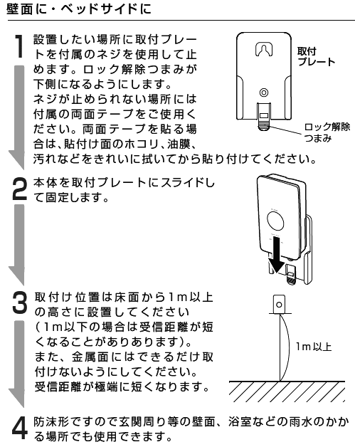 壁面に ベッドサイドに 浴室に固定して利用できます。
