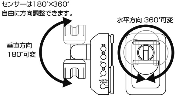センサーは垂直方向に180度、水平方向に360度動きますので、環境に合わせて自由に調整できます。