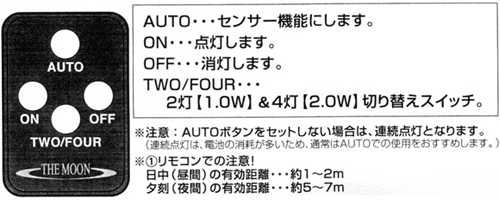 付属のリモコンで、オン、オフ、自動(センサーモード)、2灯点灯/4灯点灯の切替ができます。