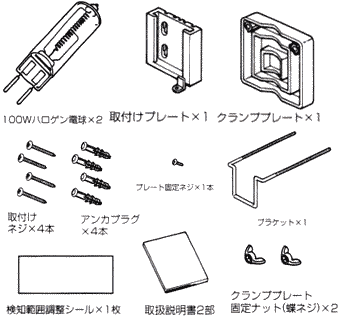 | 付属品 | ハロゲン100W×2 取付プレート ブラケット クランププレート クランププレート固定ナット (蝶ねじ)2本 探知角度調整シール1枚 プレート固定ねじ1本 取付ねじ4本 アンカプラグ4本 |