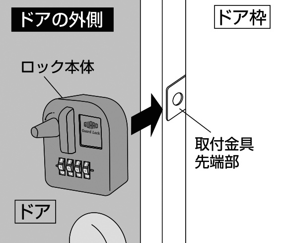 ドアを閉めて、ドアの外から取付金具先端部に暗証番号型ロック本体を差し込み施錠します。