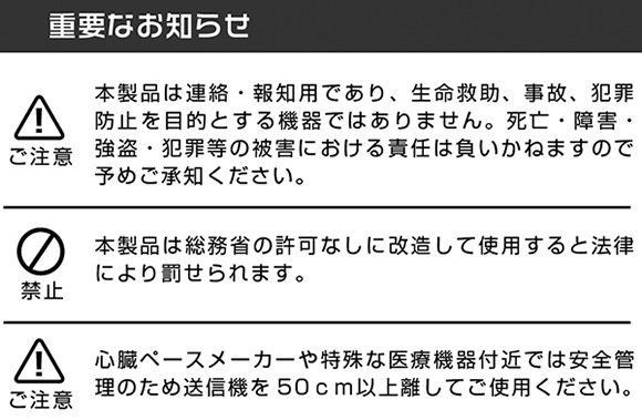 心臓ペースメーカーや特殊な医療機器付近では送信機を50cm以上離してご使用ください。